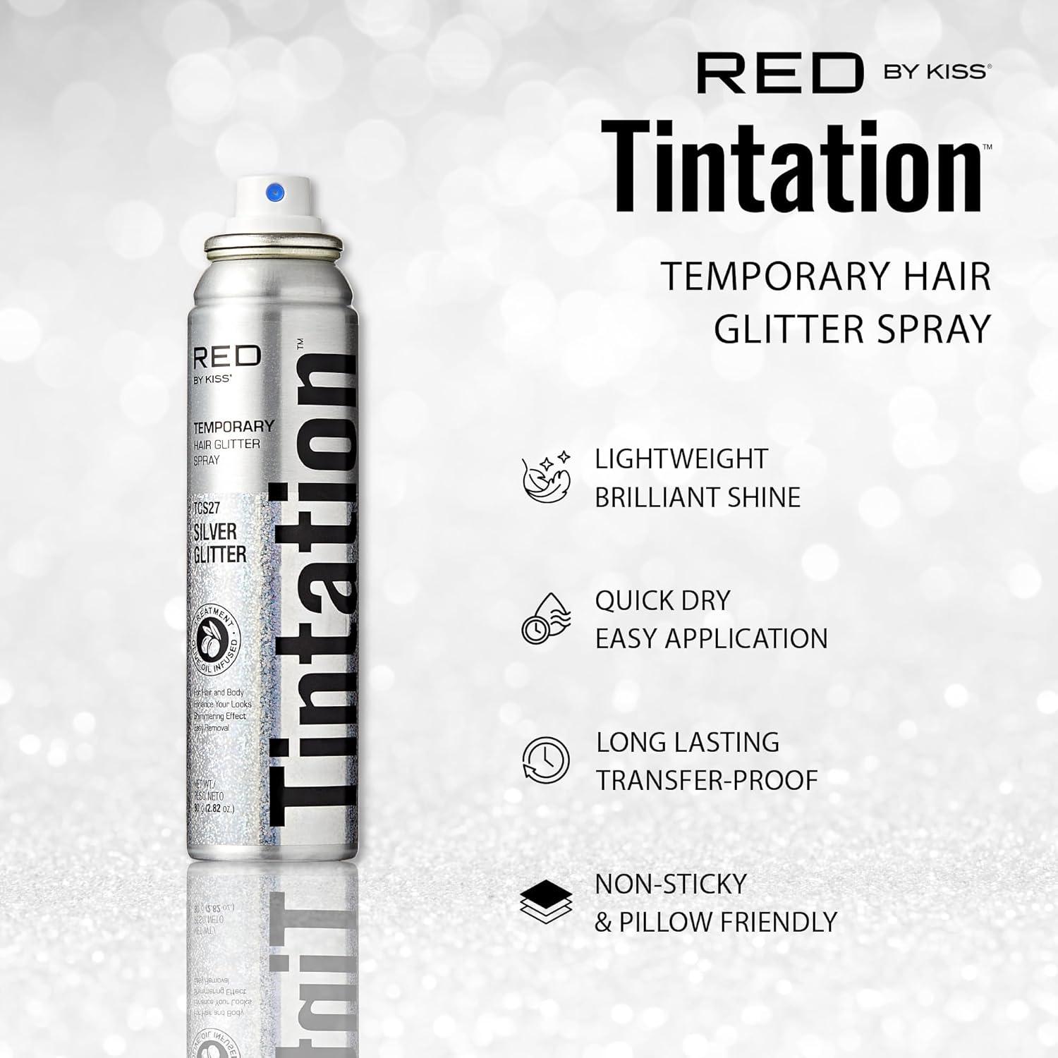Red By Kiss Tintation Glitter Spray – Long-Lasting Body & Hair Sparkle, Quick-Drying, Waterproof for Events, Parties, Festival Rave, Prom, & Cheerleader (Silver)(Silver)