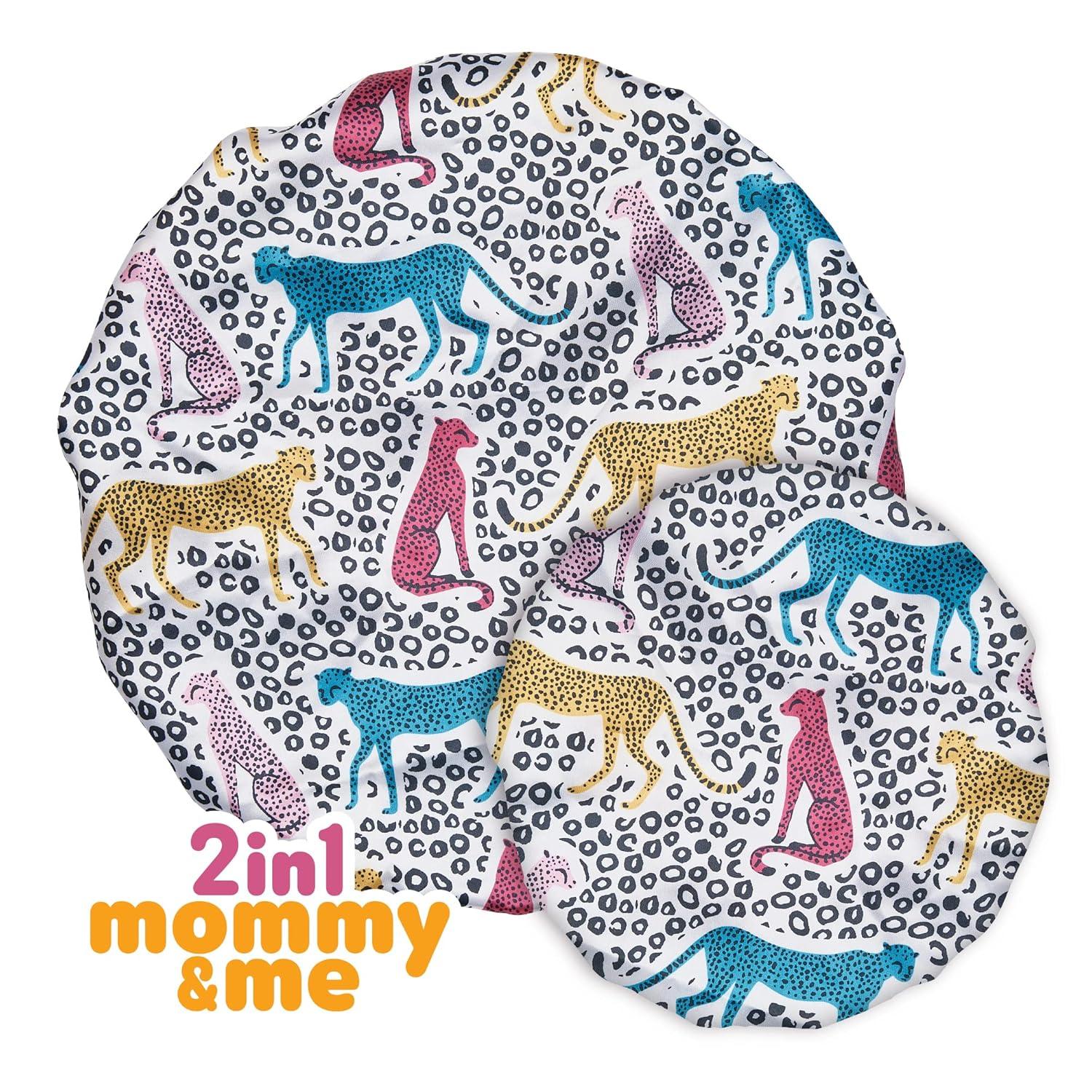 Red by Kiss 2-in-1 Mommy & Me Satin Bonnet Sleep Cap for Adult and Babies, Soft, Stretchy, and Safe, Protects Fragile Hair from Frizz & Breakage, Friction Bald Spots (Cheetah, 6-18M)(Leopard)