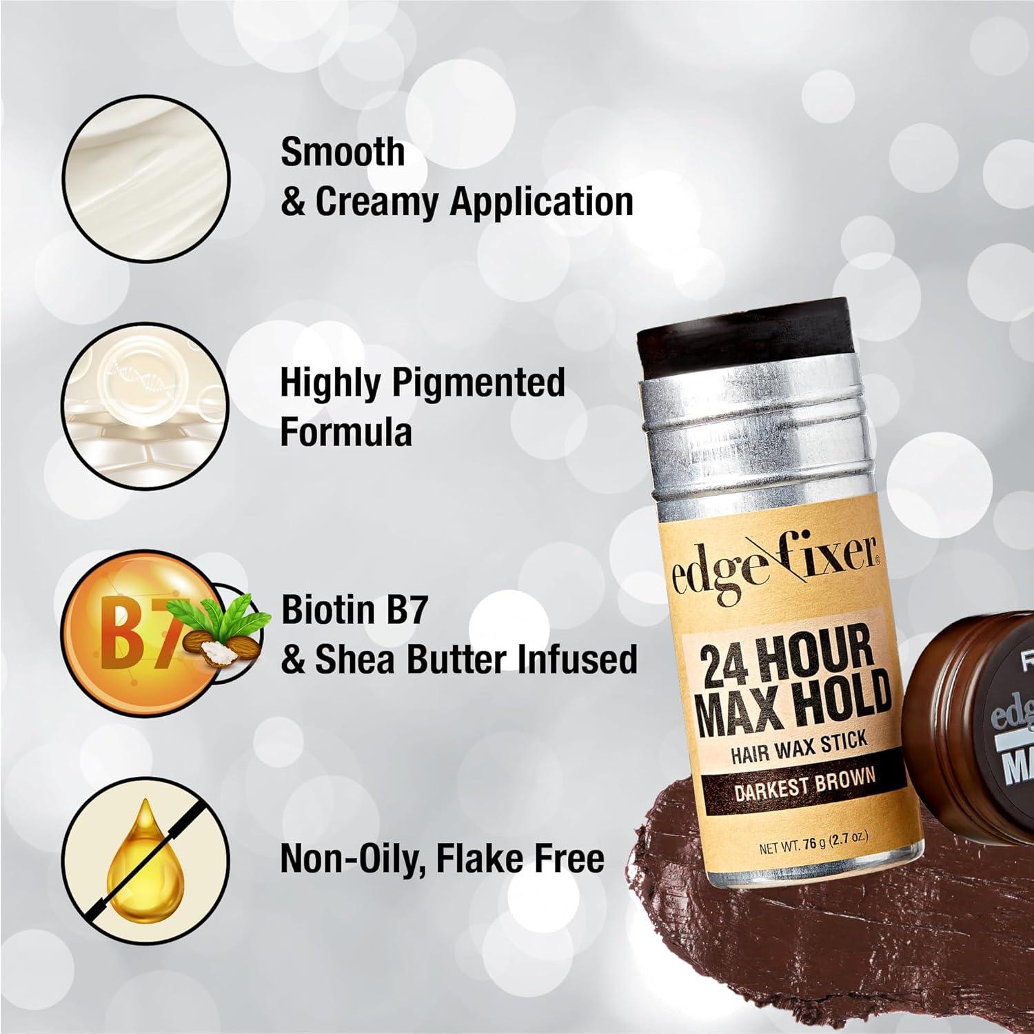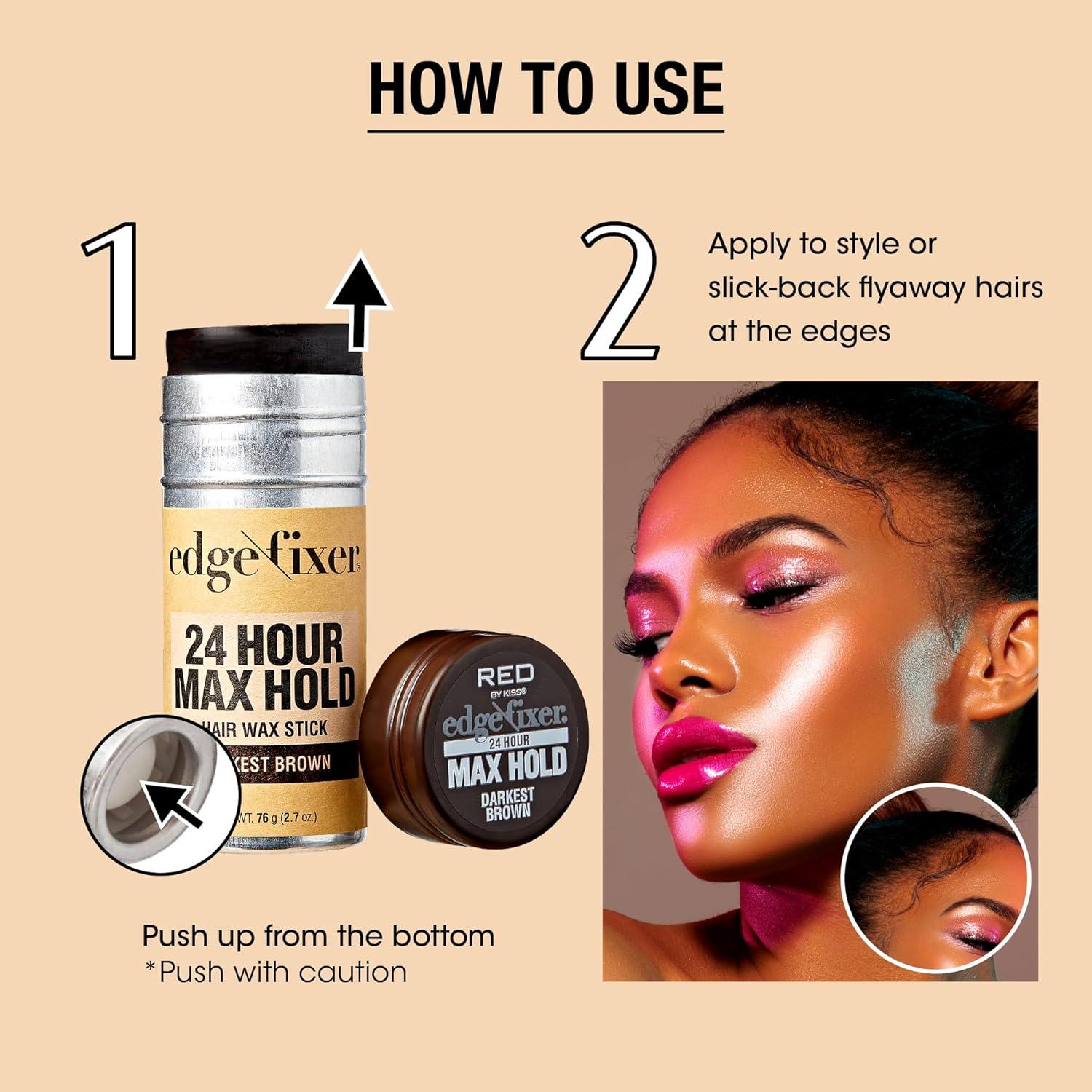 • Red by Kiss Hair Wax Stick 24HR Max Hold Edge Fixer Edge Control Pomade Non-Sticky, Non-Oily Flake Free Hair Styling Wax 2.7 oz. (Unscented)(Darkest Brown)