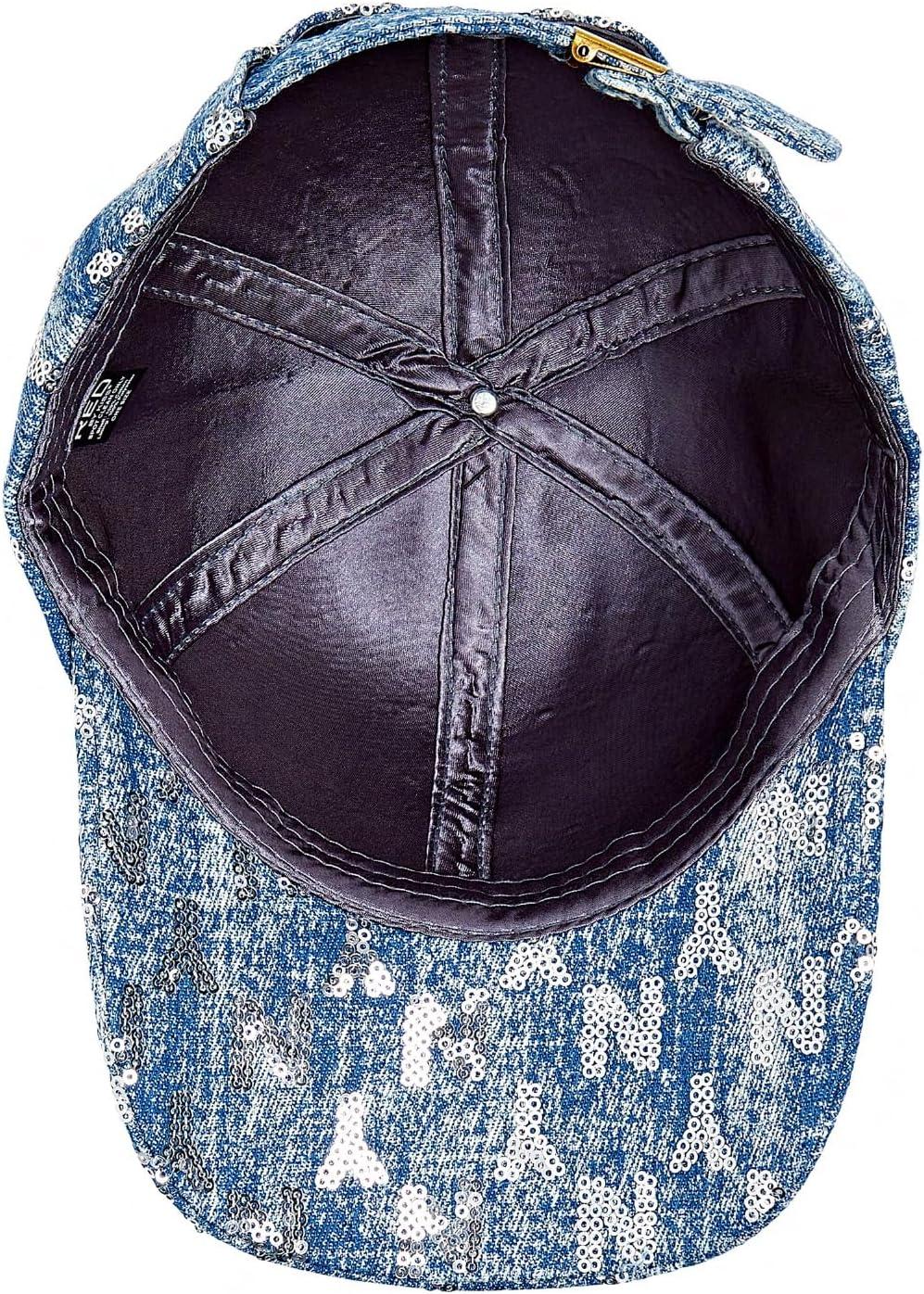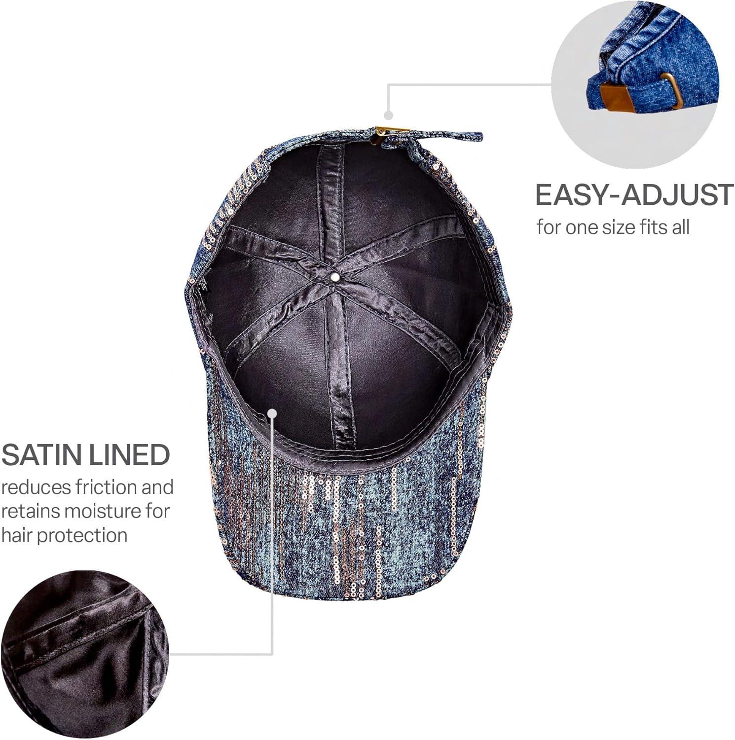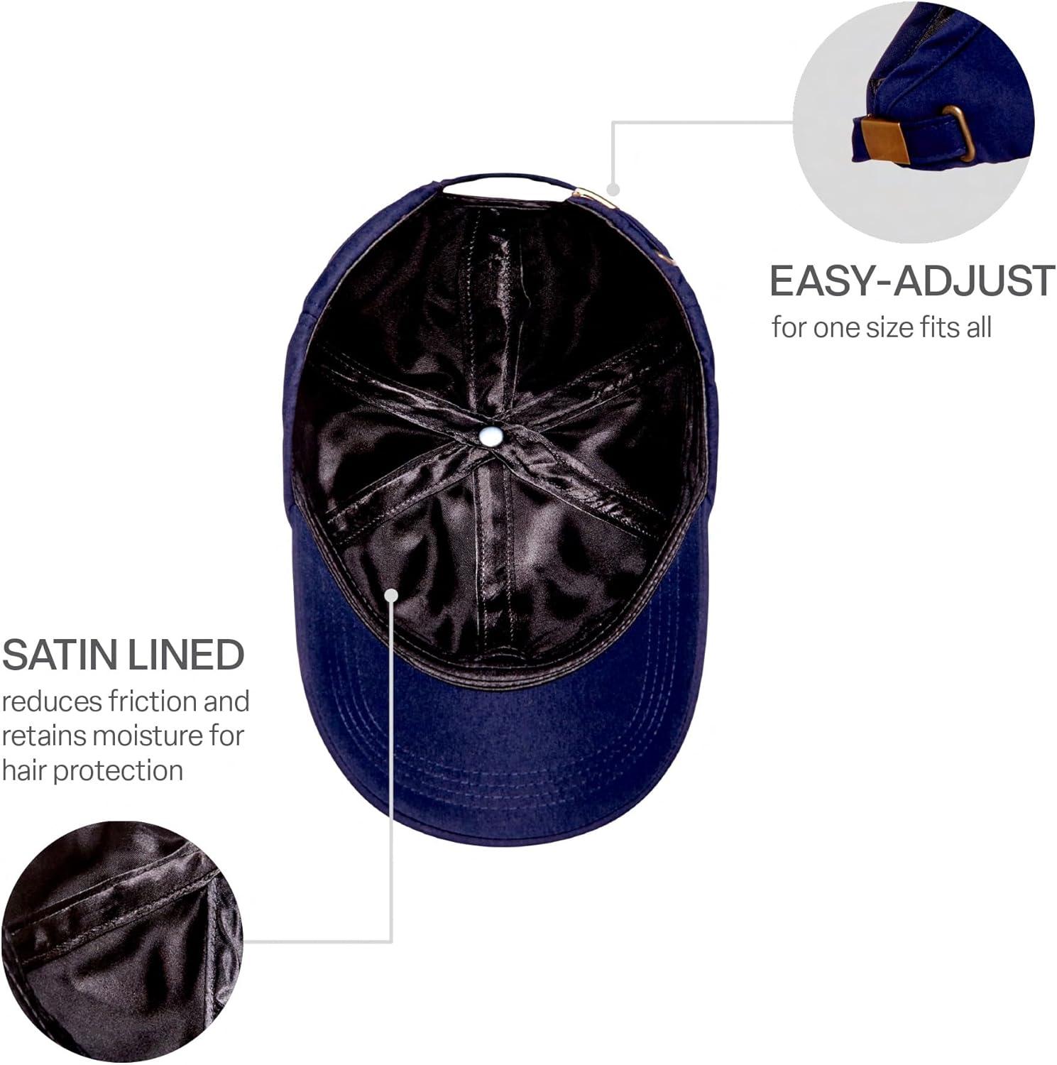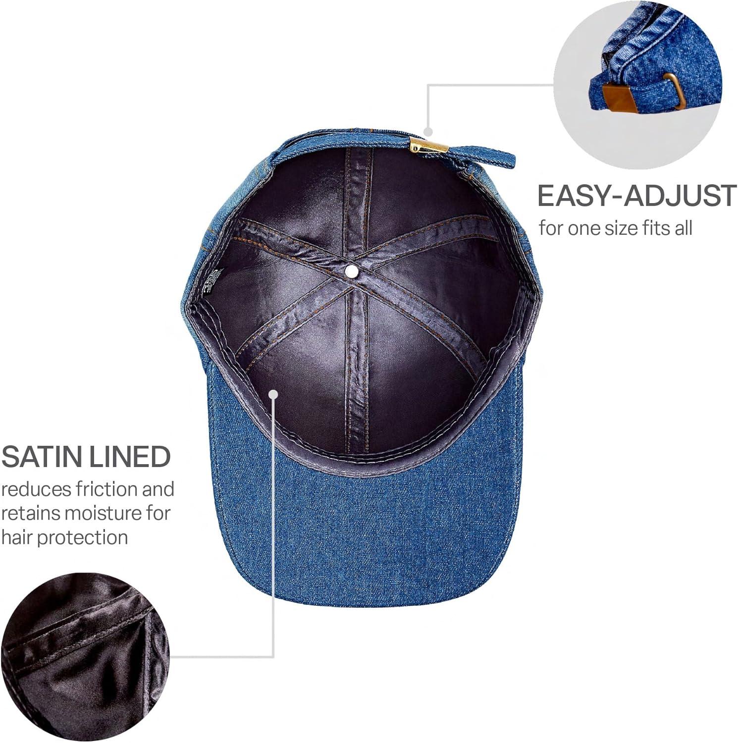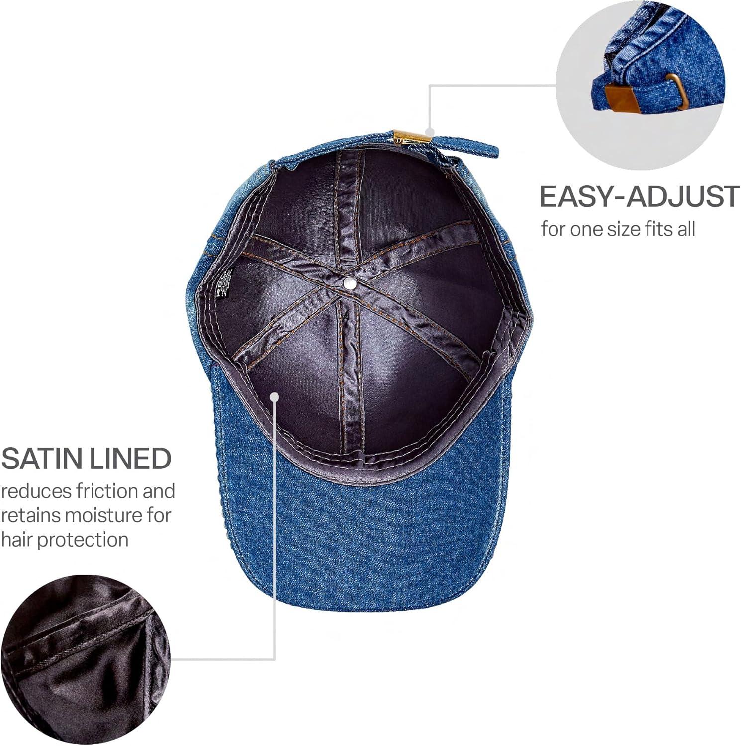 Red by Kiss Satin-Lined Backless Baseball Cap, Comfortable Fit Adjustable Hat for Ponytail Designs Fashion(Denim)