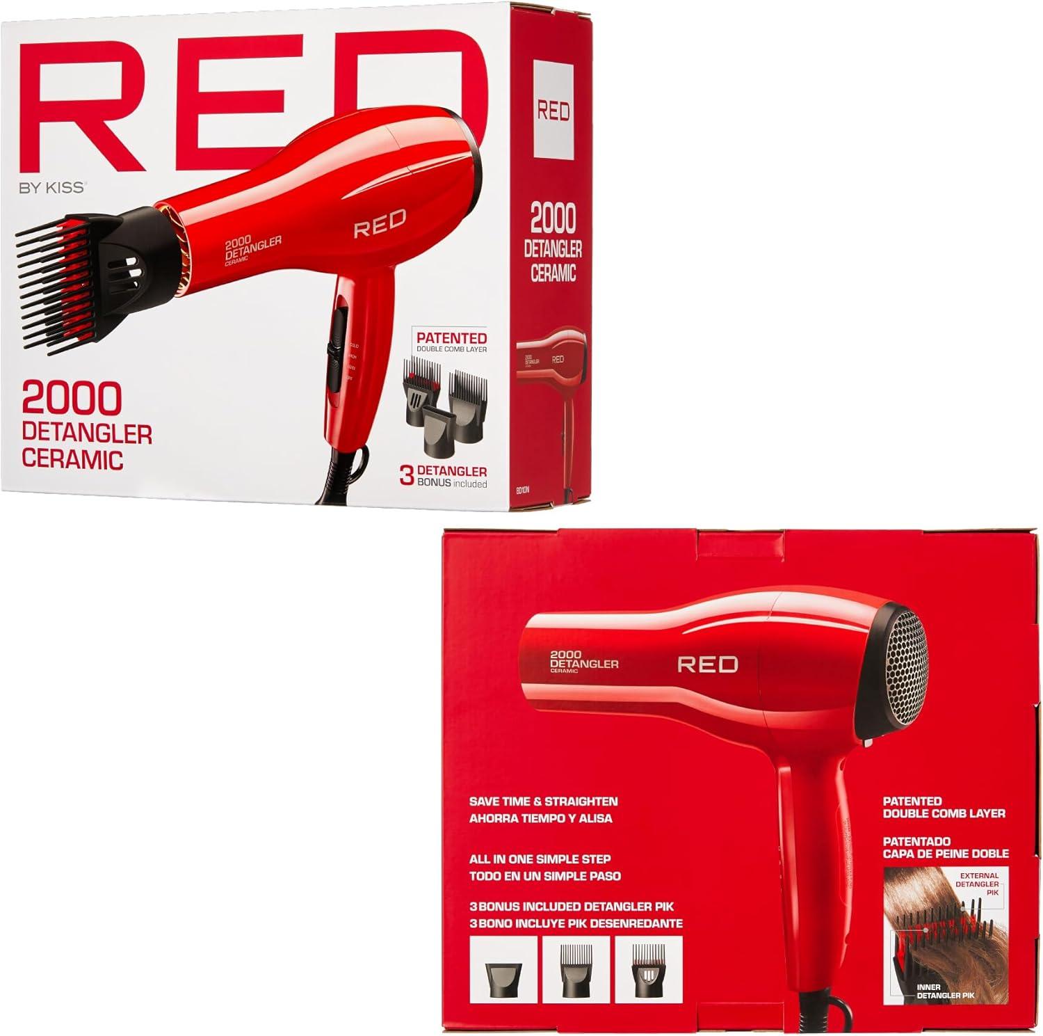 RED by KISS 2000 Ceramic Hair Dryer, Professional Salon Blow Dryer, 2 Detangler Pik Attachments, Tourmaline Technology, 3 Heat Settings, Easy Storage Loop (Pink)(Red)
