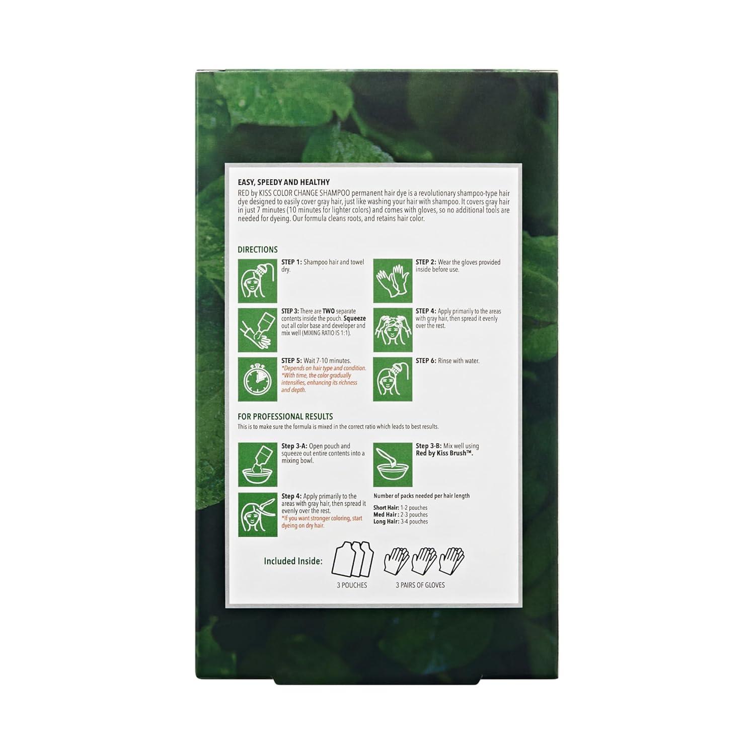Red by Kiss Color Change Shampoo – Permanent Hair Color with 100% Gray Coverage, Quick 7-10 Minute Formula, No Tools Needed, Herbal Extracts, Includes 3 Shampoo Pouches(Medium Brown)